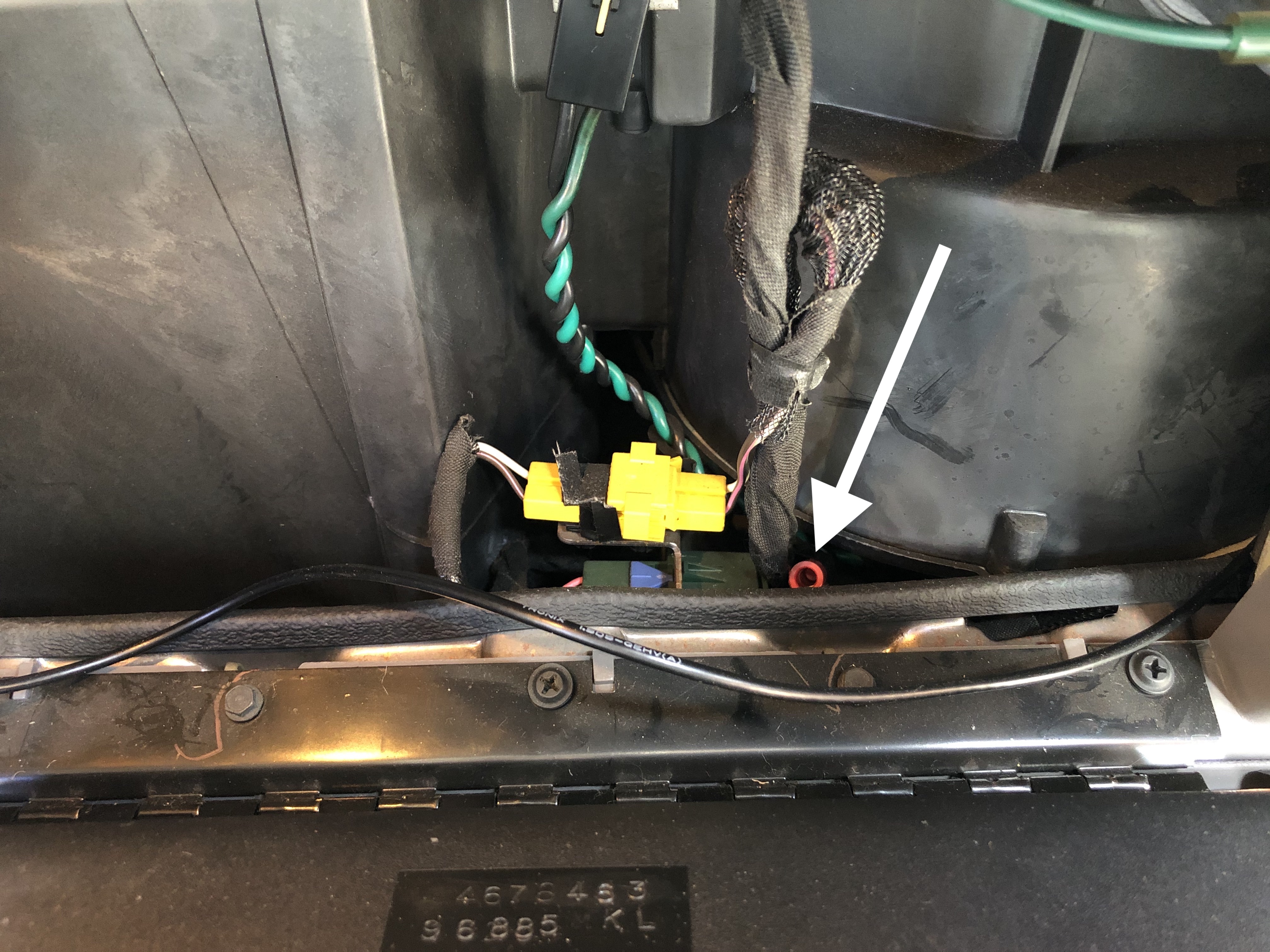 Zum Starten des Anlernmodus muss ein Kontakt hinter dem Handschuhfach auf Masse gelegt werden und anschließend die Fernbedienung betätigt.